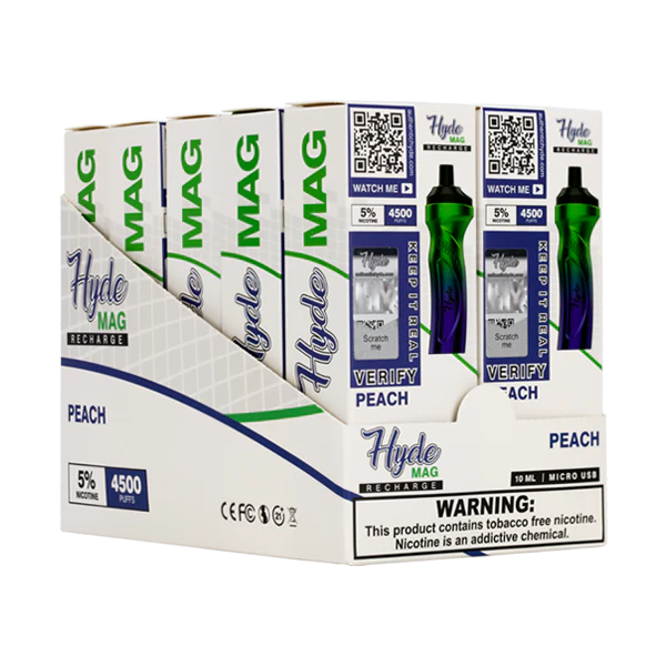 Hyde Peach Mag offers authentic peach flavor with 10mL pre-filled e-liquid and 4500+ puff count. Features 50mg nicotine strength, rechargeable battery, and Micro USB charging. Perfect for adult vapers seeking premium peach satisfaction.