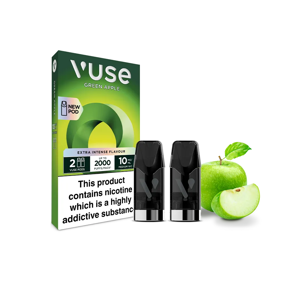 Vuse Green Apple Refill Pods: Tart green apple and smooth sweetness blend. 5% nicotine salt, leak-resistant design, and ~1000 puffs. Compatible with Vuse ePod 2 devices. Adult-only.